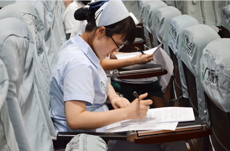 (中新合资)广州现代医院全院范围的护理理论知识考试每半年举行一次,每次根据日常护理工作的具体情况抽选不同章节出题。全院护士在考试前均在工作之余认真复习备考,理论与操作都不断巩固加强。