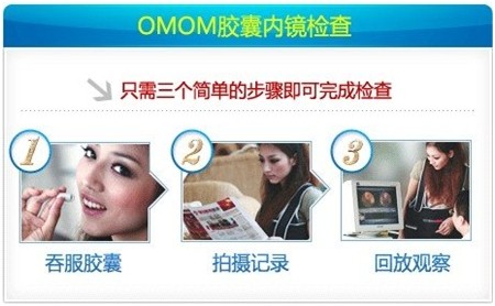 “OMOM胶囊内镜”全称为“智能胶囊消化道内镜系统”。患者在检查肠胃时只需用水服胶囊,它就会随着胃部的蠕动,通过胃、十二指肠、空肠与回肠、结肠、直肠等各个部位,对全程做出拍摄,然后以数字信号传输图像到病人随身携带的记录装置上,医生可根据检查的结果进行诊断。