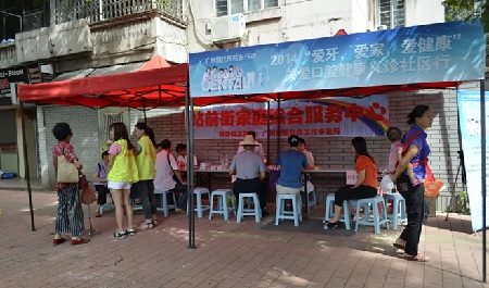 为迎接全国爱牙日,增强市民重视口腔健康意识,广州现代医院口腔科医务人员与义诊组一大早就来到了流花路华侨新村社区,开展口腔专科义诊。此时正值人流出行高峰期,在看到有免费口腔健康检查时,街坊邻居们都纷纷停了下来,接受专业口腔检查,聆听医务人员口腔知识讲解,索取牙齿护理宣传资料等。