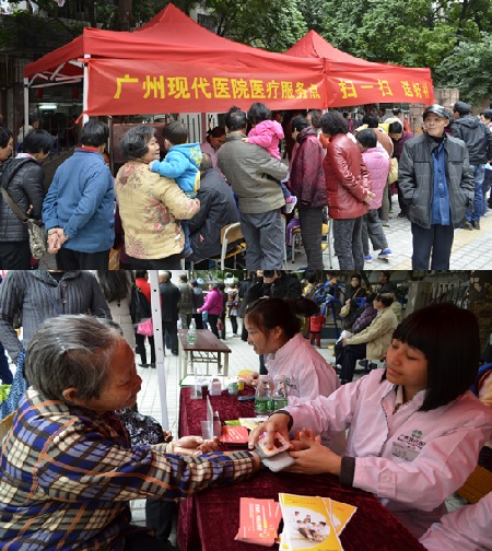 在广州现代医院医疗服务点,义诊医生们免费为市民提供血压、血糖检测,医保咨询等服务