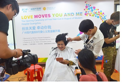 8月4日下午,(中新合资)广州现代医院爱心义剪活动如期开展。活动中,来自粤一流发型集团AC发型顾问中心的理发师义工们,为在院外籍患者与家属们,免费提供了专业剪发服务。