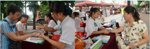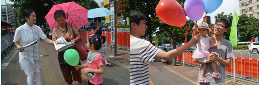 【现代工作人员向市民派发健康宣教资料和精美礼品】