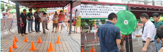 上午9点开始,广州现代医院从临床一线抽调医护人员组成的义诊医疗队冒着烈日一边帮市民免费测量血糖、血压,一边提供健康指导,为市民答疑解惑,专业而热情的服务吸引越来越多市民前来体验义诊服务。为了让市民学到家庭实用的健康急救知识,广州现代医院特别设置了健康宣教区,由工作人员现场播放心肺复苏演示视频,并发放健康科普宣教读物。场面火爆的要数健康游戏区,男女老少们一边玩套圈圈、幸运大转盘、呼啦圈等游戏,一边赢取精美健康礼品,玩得不亦乐乎。