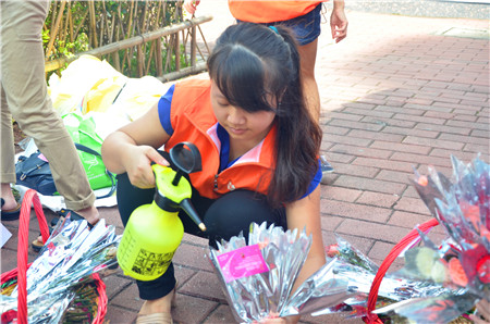 早上8点30分,一枝枝娇艳欲滴的玫瑰花被精心地包装好,放在篮子里,“蓄势待发”!它们是帕察丽家乡的代表,更是帕察丽救父的希望。在广州义工联广州现代医院义工组的协助下,帕察丽和义工们在燕塘地铁口处开始了义卖玫瑰花的活动。