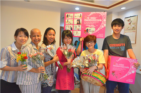 令人感动的是,义卖玫瑰之前,院内已经有患者提前知道了活动的消息,不少患者纷纷表示也想献一份爱心,希望义工们能将鲜花带到病区来。当天下午,义工们带着鲜花来到了病区进行义卖,同样来自泰国的5楼病区21床患者黄宋丝和19床患者的家属们在了解情况后主动表示要加入义卖团队中去,身体力行献出自己的一份爱心,帮助帕察丽一同完成救助父亲的行动。