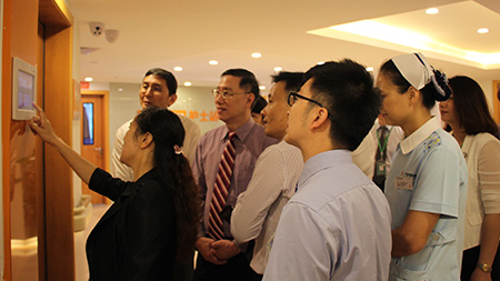 首先,在医院领导以及医务部、护理部、质管办等职能部门负责人的陪同下,莅访嘉宾一行参观了医院,走访了各门诊科室、新病区、远程会诊中心、患者活动园地、患者公用厨房等,也实地观摩了医院的人性化护理服务。