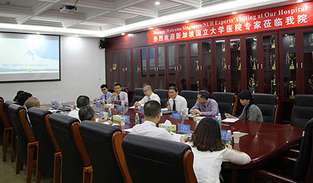参观结束后,NUH嘉宾与集团、医院领导进行了初步会谈。王怀忠院长致欢迎辞,并表示,“去年有幸到NUH交流学习,我们的工作也有了很大改进。各位专家的到来是对我们工作的检验和指导,我们全体都会带着学习的心态来进一步做好我们的工作。”
