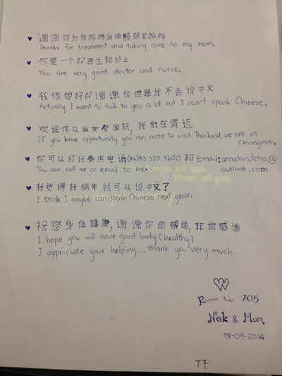 前日,肿瘤七病区11床的泰国患者思丽拉的家属写给医护人员一封感谢信,“你们是好医生、好护士,我很想好好说声谢谢但我不会中文……祝你们身体健康,非常感谢!”虽然语言不通,但她们用质朴的方式表达了心声。