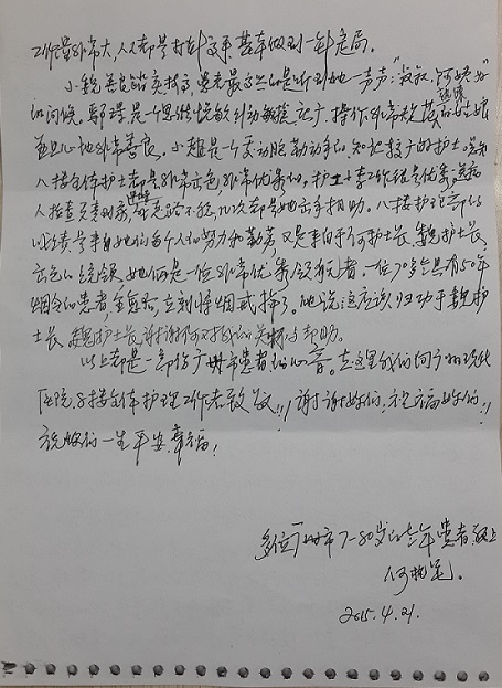 上面这封特殊的感谢信,是多位广州市70-80岁的老年患者们共同的心声。信中恳切的言语、源于内心真情的流露,概括了每位护理人员的特长及优点,表扬综合病区全体护理姐妹们“专心、专业、敬业的精神。据悉,在患者的心中,(中新合资)广州现代医院医护人员的关爱与照顾已成为患者的身心健康的“保护神”。