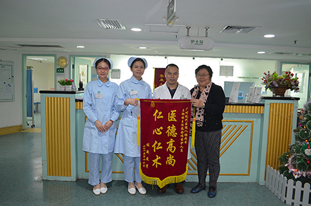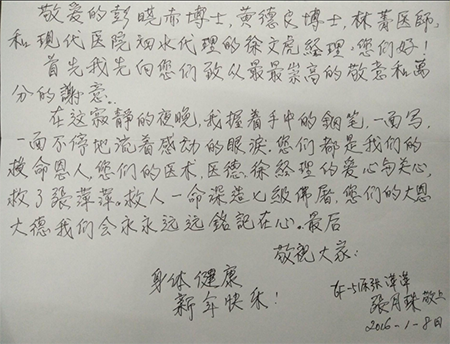2016年1月8日,患者张萍萍和张月珠将感谢信送到医护人员手里,信中对肿瘤科彭晓赤主任、黄德良医生、林菁医生、徐文虎经理等广州现代医院的医护人员表示崇高的敬意和万分的谢意。“你们都是我们的救命恩人,你们的医术、医德我们会铭记在心。”