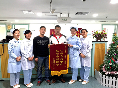 2016年1月4日下午,四名病友联名敬赠锦旗给广州现代医院血透中心和八楼病区全体医护人员,感谢医护人员在他们治疗过程中以精湛的医术和无微不至的关怀对他们给予帮助。这四名病友长年累月在广州现代医院血透中心接受治疗,与医护人员的关系如亲人一般。