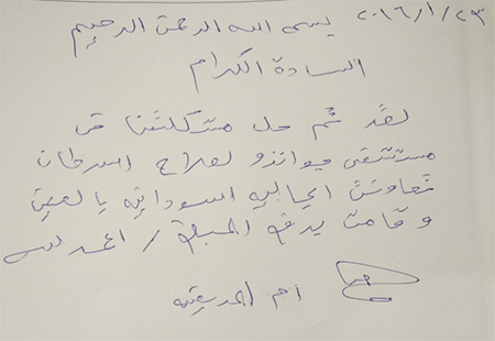 以上信笺是苏丹商会会长:阿卜杜·法黑德·勒翰麻写来的,感谢广州现代医院肿瘤七病区全体医护人员及两位阿语翻译在苏丹国籍患者艾拉住院期间无微不至的照顾,感谢医院对患者的帮助。“愿真主祝大家工作顺利,身体健康!”