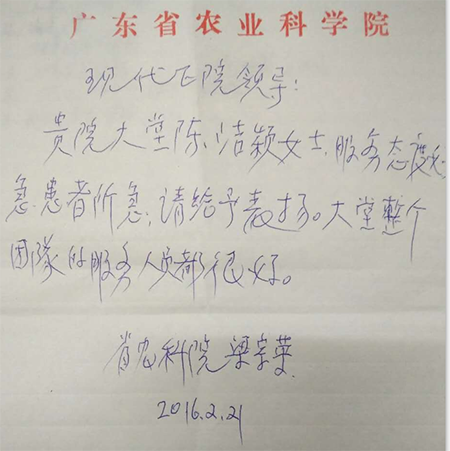上面这封表扬信是广东省农科院退休干部梁宗荣老人家亲自写的。其在陪同亲属在广州现代医院体检以及拿报告期间受到大堂客服专员陈洁颖耐心的接待,并为其解决困难。“急患者所急,服务态度好”,老人家信中还称赞医院“大堂整个团队的服务人员都很好”。