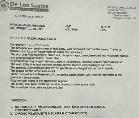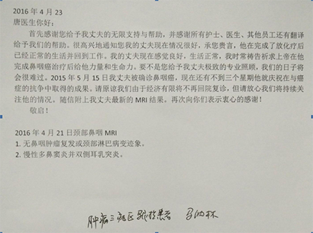 这是一封从海外寄过来的感谢信。海外患者马纳林患有鼻咽癌,到广州现代医院经过近一年的治疗,出院后恢复情况理想,并已回到工作岗位。其妻子特寄来感谢信与复查报告,感谢广州现代医院肿瘤科的唐祥专医生、所有医护人员以及翻译人员对他的帮助。