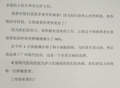 这是一封来自肿瘤五病区的印尼患者周*源的感谢信,感谢王剑医生、护士及MDT团队,因他们的实力与积极有效的工作使他的肿瘤缩小了90%,来到广州现代医院治疗是一个非常正确的选择。