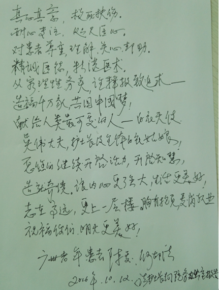 这是综合病区陈爱和何郁清送来的感谢信,感谢综合病区吴伟医生及全体护士,信中写道:“真心真意,救死扶伤;耐心专注,咫尺医心;对患者尊重,理解,关心,帮助。”