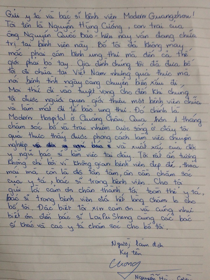 这是来(中新合资)广州现代医院自5楼39床越南肿瘤患者阮雄强写来的一封感谢信,表达他父亲在住院期间给予他们关心和帮助的医护人员的感激之情。卓越的医疗技术、耐心负责的态度、无微不至的关心着患者及家属的医务人员让患者对治疗充满信心。在信中感谢医护人员无怨无悔的投身于平凡而伟大的医疗工作,所有的这一切都在平凡中孕育,这种平凡感动每一位患者及家属。