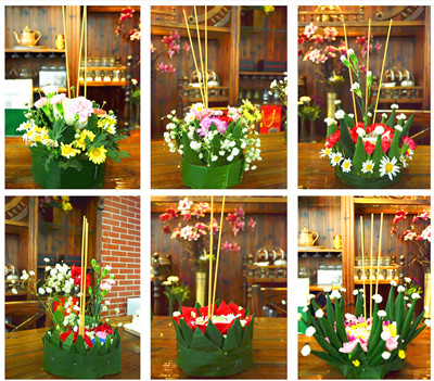 以裁切好的芭蕉树干为底座,将裁剪好的芭蕉树叶折成各种尖角,用牙签固定好,再配以各种颜色的小雏菊、康乃馨、玫瑰、满天星等鲜花、后一个花香四溢、小巧精致的水灯就大功告成了!尽管都是来自泰国,但他们制作的水灯却风格不一,各有特色,别致的造型充分体现了泰国人的心灵手巧。5楼的泰国患者丽达婉的女儿告诉笔者:“以前水灯节的时候,家里的河灯多数都是在外面买回来的,很少自己做,所以这次自己做河灯,真的觉得很好玩也开心。”