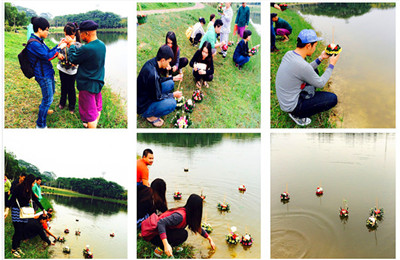 期间,一位泰籍阿姨还专门跟我们科普了一下关于“水灯节”的知识。为什么要放河灯呢?泰国朋友告诉我们,放河灯有几层意思:一为泰国以前常常闹水灾,放河灯是祈福未来的一年风调雨顺,不再有水灾;二为泰国祈福,祈福国家更加繁荣昌盛;三为自己和家人祈福,希望自家人朋友在来年都能健康、平安。在泰国人的眼中,随着河灯的漂流,过去的不幸都会离自己远去;承载着希望的河灯,也会将他们对远方朋友的祝福送达。