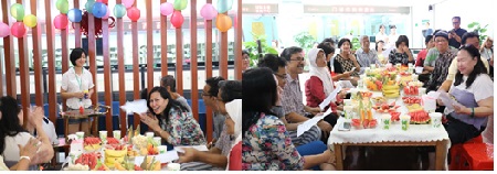 开斋节晚会以清真自助餐形式举办。晚会开始前,医院7楼的小厨房里, 患者家属们亲自擀面皮,包饺子,洗菜,炒面,为开斋节准备清真食物. 咖啡吧里, 广州现代医院的工作人员们也把五颜六色的水果洗好切块, 搭配好放到果盘里,和一盘盘小点心在大长桌上排成长列,等待客人们的到来。
