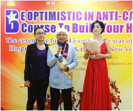 泰安、露兰、石鸿星、黄春妹、罗丽芳、叶宝龙等10名来自东南亚各国的癌症患者被评为广州现代医院2015年度抗癌明星,现场获颁奖杯、证书等。据介绍,他们在广州现代医院治疗期间,都做到了勇敢、乐观对待癌症,并积极配合医生进行治疗,后都取得了良好的效果。