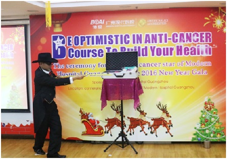 12月23日晚,2015广州现代医院年度抗癌明星盛典暨迎新年联欢晚会隆重举行,活动对抗癌明星进行了表彰,并表演了川剧变脸、魔术、口技、歌舞等精彩节目。200名海外患者及其家属来到活动现场,在洋溢着健康、欢乐的氛围里,共迎圣诞节和新年的到来。