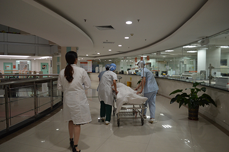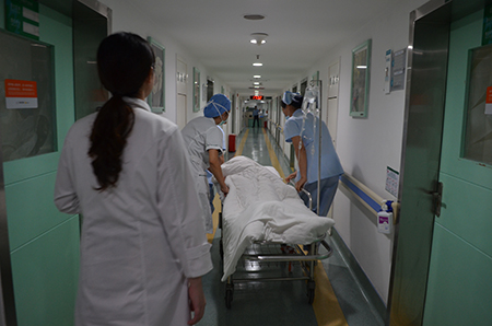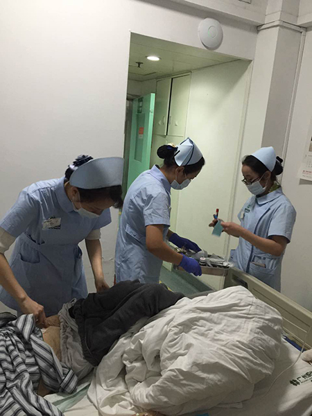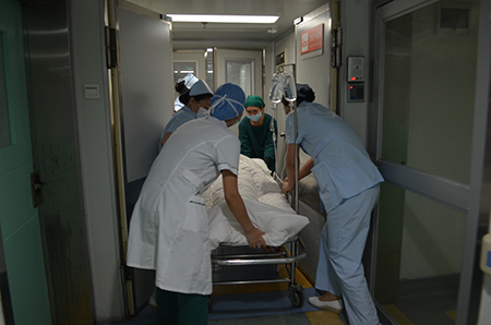 何亮琼主任通知6楼病区护士长疏通两条通道,并安排护工控制电梯在2楼等候。ICU早已做好收治病人的准备。ICU护士在门口等待,其他护士准备呼吸机和监护仪。