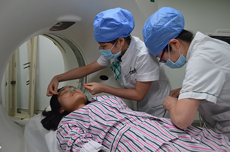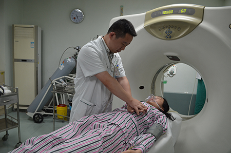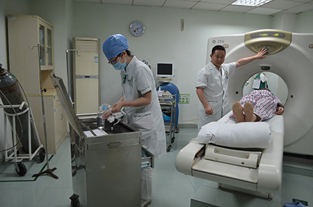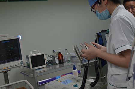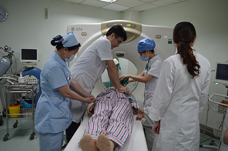 紧接着,麻醉科主任孔德军为患者实施气管插管,插管成功后,让患者借助简易呼吸器辅助呼吸。戴文燕主任在旁边跟患者家属解释患者目前情况:“病人在进行CT检查时出现过敏性休克,导致呼吸心跳骤停,经抢救已恢复心跳和意识,目前暂时未脱离危险,需转入ICU进一步治疗。”