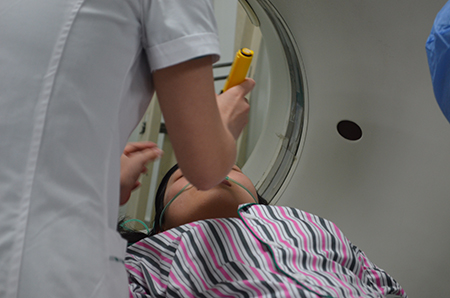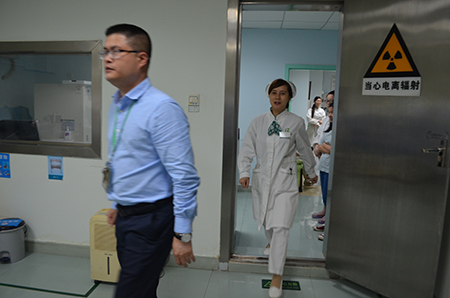 17:10分,演练开始。在广州现代医院2楼CT室,影像科查煌旗医生正在给患者行上腹部平扫+增强,平扫完成后,进行增强扫描操作设置。查医生按下高压注射器及CT扫描“启动键”。15秒后,护士甲发现患者突然出现面色苍白、咳嗽、呼吸困难,并立即将情况告知查医生。随后,查医生按下“紧急停止键”,呼叫患者无反应,无脉搏,因此判断患者造影剂过敏。“马上更换生理盐水,进行肾上素针1mg皮下注射,吸氧3L/分,立即心电监护。”查医生对护士甲说。护士甲立即呼叫护士乙:“患者造影剂过敏,马上推抢救车和除颤仪到检查室。”之后换上输液管接生理盐水,复述药物名称确认无误后静推肾上腺素1mg,连接心电监护仪。护士甲将患者情况报告查医生:“患者心率58次/分,血压76/50mmHg,血氧饱和度75%。