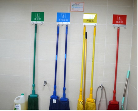 针对保洁工具的摆放,何凤玉主任要求:保洁人员必须清楚相关区域的划分,人员应相对固定、明白各区域清洁、消毒用具的使用方法;保洁工具需定点按标识放置,清洁、污染的不能混用。
