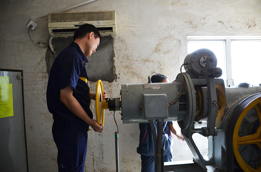 电梯维保人员到达后,先停电,判断轿厢所处位置,确定盘车方向和平层楼层,并向总指挥报告。总指挥立即安排工程组汤学军进行盘车,让电梯与4楼平层。