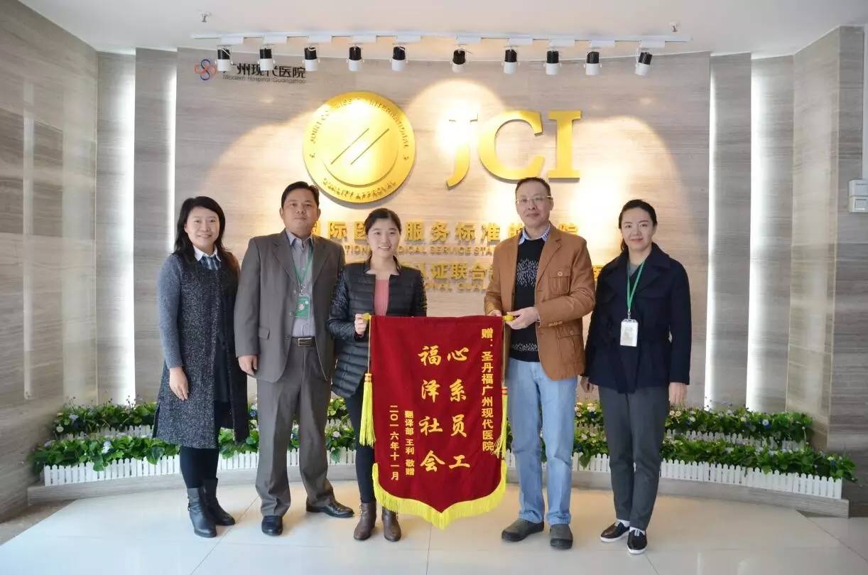 为感谢医院对其一家的帮助,王利特为医院送来一面锦旗,上面写着的“心系员工、福泽社会”,正是广州现代医院一直以来的真实写照:在医疗技术上,永远追求国际化的高品质;在患者服务上,坚守着“一切以患者为中心”的人文关怀;在院内文化上,为员工营造家一般的温馨。