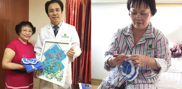 图为吴氏秋香的姐姐亲手为彭主任送上手工挂画,还有给彭主任小孩的帽子与衣服。彭主任接过礼物感动地说道:“等我小孩穿上这帽子跟衣服,我一定拍张照片给你看。真的十分感动,感谢患者及家属对圣丹福广州现代肿瘤医院的赞赏与肯定。”