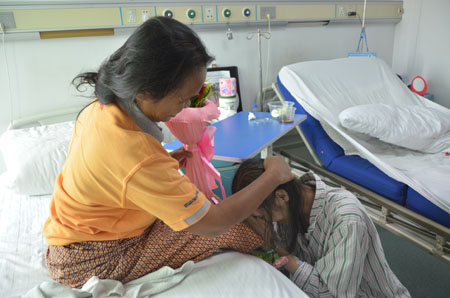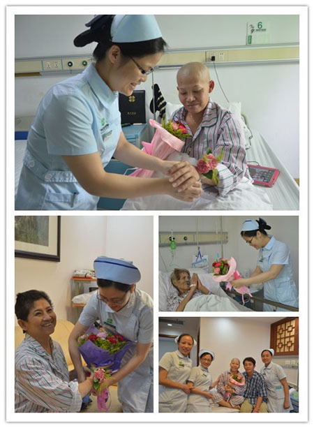 五楼的泰国患者黄宋丝在母亲节这天也迎来了她78岁的生日,楼层的主任、护士长和她的主治医生为她准备了惊喜——生日蛋糕和康乃馨。进门之前,大家一起点亮生日蜡烛,然后小心翼翼地推进去,戴文燕主任为黄宋丝送上康乃馨,主治医生赖沛生为她戴上腕带,两个女儿亲吻了她的脸颊,在温馨的生日歌和掌声中,黄宋丝带着感动许下愿望……对黄宋丝而言,这注定是一个难忘的生日!
