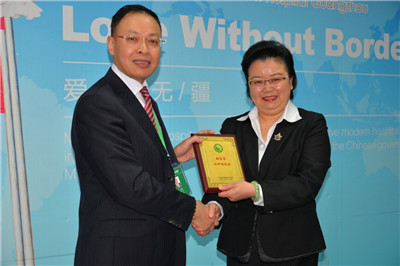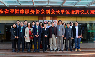 广东省亚健康服务协会授予(中新合资)广州现代医院 “广东省亚健康服务协会副会长单位”称号。此图为广东省民政厅社会组织管理局副主席李志华(右)莅临仪式现场,为医院授牌。