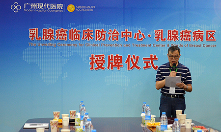 授牌仪式由广州现代医院行政部主任杨金娜主持。陈兵副院长宣读广州现代医院“乳腺癌临床防治中心”以及“乳腺癌病区”正式成立文件。陈兵副院长表示:“肿瘤专科作为广州现代医院重点科室,建院以来不断引进海内外先进医疗技术与设备,乳腺癌临床防治中心和乳腺癌病区的成立标志着广州现代医院肿瘤专科发展到了新的高度,不同科室的交融合作给患者带来一体化的肿瘤防治医疗服务。”
