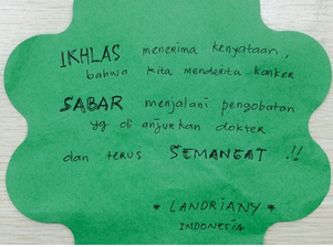 兰迪雅尼来自印尼泗水,今年已经50岁的她在2014年被确诊为卵巢癌,手术和放化疗曾让她头发全部脱落,印尼本地医生曾以“病情太过严重”而放弃对她的手术治疗,但是笃信基督的她一直都这样劝慰自己:“如果不能改变,那就接受癌症,乐观治疗,一切都会变得更好。“