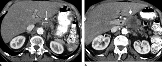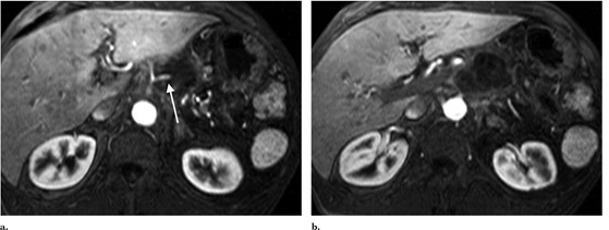 MR image at 1 month after IRE procedure. (a) Superior aspect of tumor shows no residual enhancement of tumor, with maintained patency and appearance of the splenic artery (arrow). (b) At the level of the superior mesenteric artery, complete necrosis is also seen.
