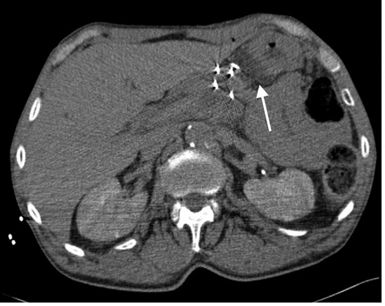 一名76岁的非裔美国男性诊断出患有不可切除胰腺癌III期(肿瘤/瘤/转移阶段)在他拒绝了化疗和射频之后二次血管入侵使得他选择了经皮IRE(纳米刀消融术)技术。CT成像(图表 1)表明4.1X4.1X3,5cm肿瘤包含腹腔动脉,肠系膜上静脉的起源,肝外门静脉堵塞和上肠系膜静脉。全身CT扫描显示没有转移性疾病。
