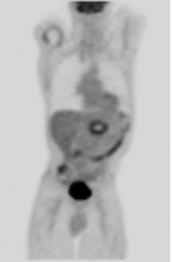 在随后两周的随访中,病人出现轻微间歇性疼痛,没有出现疲劳,发烧或其他症状。每次消融后24小时之内都使用对比增强磁共振成像(图3),第二次消融后的30天预期消融区没有出现增强。消融区的脉管系统尤其是脾动脉和肠系统上动脉保持明显不变的术前外表。血清肿瘤抗原在消融手术后30天从1500U/mL减少到404U/mL90天达到407U/mL。诊断后使用PET/CT成像(图4)如图所示出现了一个轻微的氟脱氧葡萄糖周边圈。虽然没有观测到参与肿瘤或节似疾病,但是在治疗后的三个月PET/CT扫描出了1.5cm的肝转移。因病变远离大血管在经皮RF消融后肝转移被成功治愈,然后开始吉西他滨化疗。RF消融两个月,诊断后六个月,磁共振成像显示腹部没有疾病恶化或复发。癌症病源19-9水平六个月减少到236U/mL。